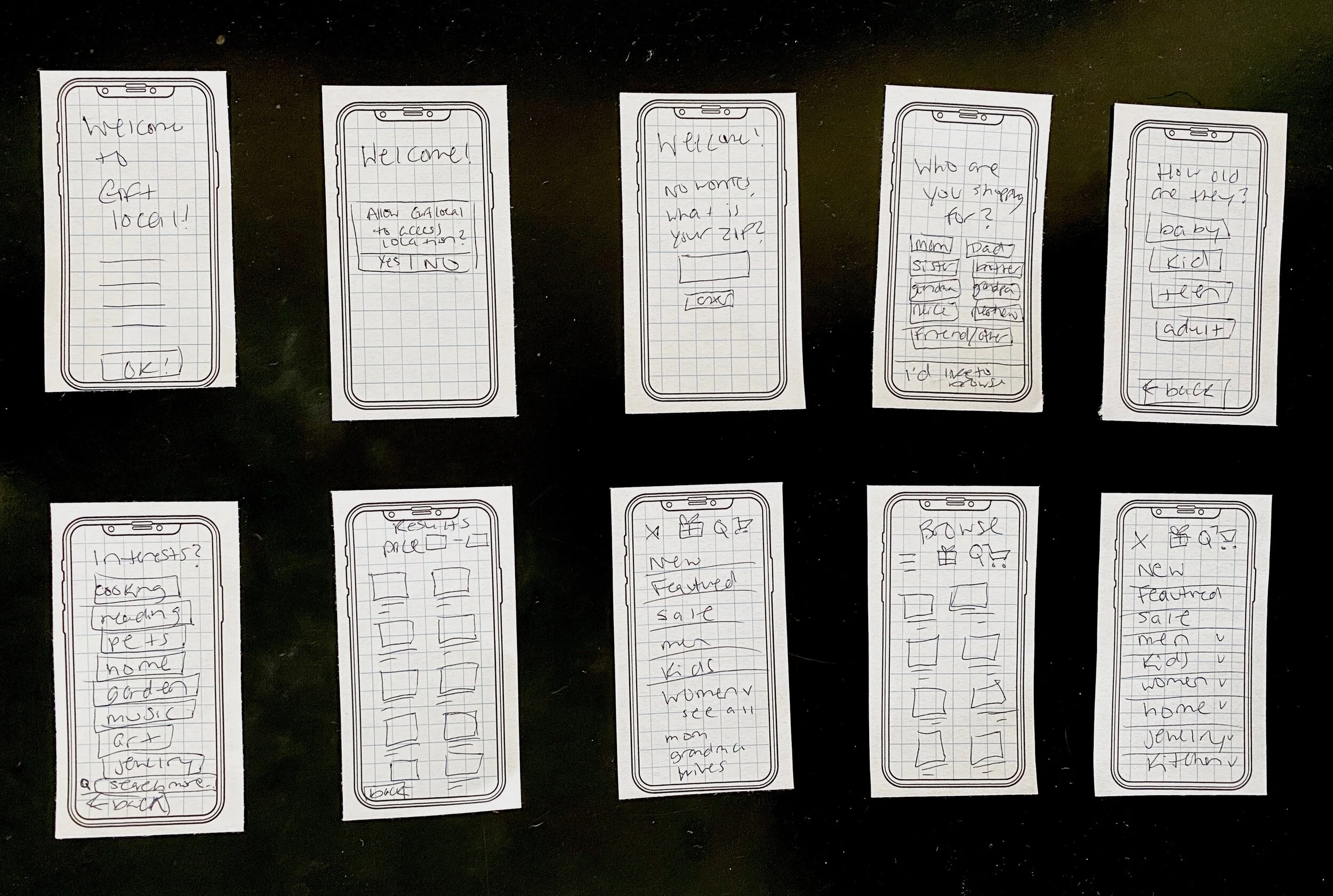 I created a flow chart from when you start using the app to when you arrive at the browsing screen. The location must be enabled or you need to enter a zip code to use the app. Then you will be taken to the gift quiz, but can opt out and just browse. The quiz will ask you a series of questions about who you are shopping for to provide matching results. This helped me visually create the flow of the app.