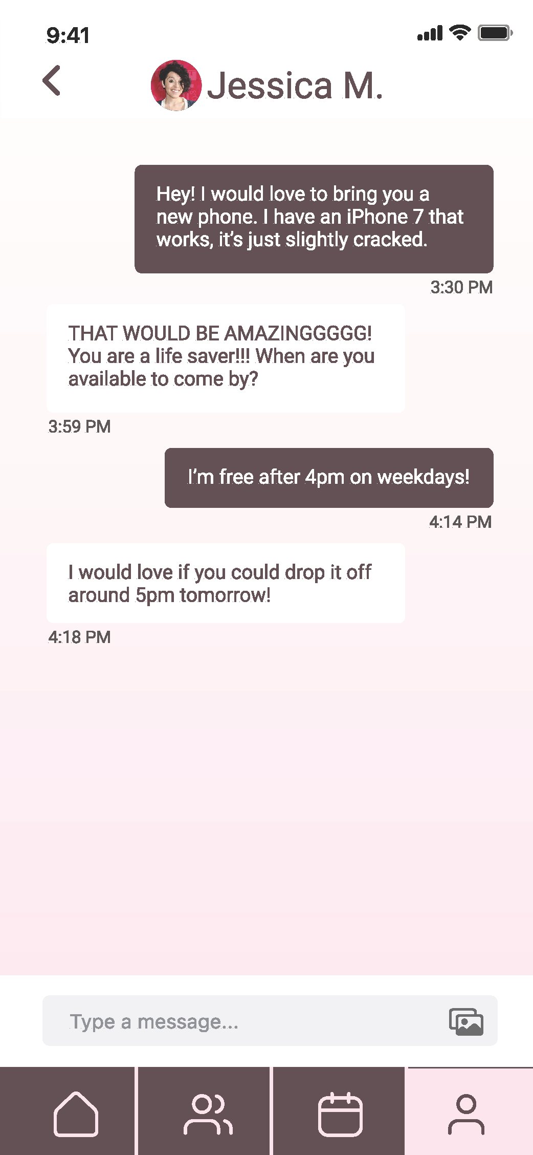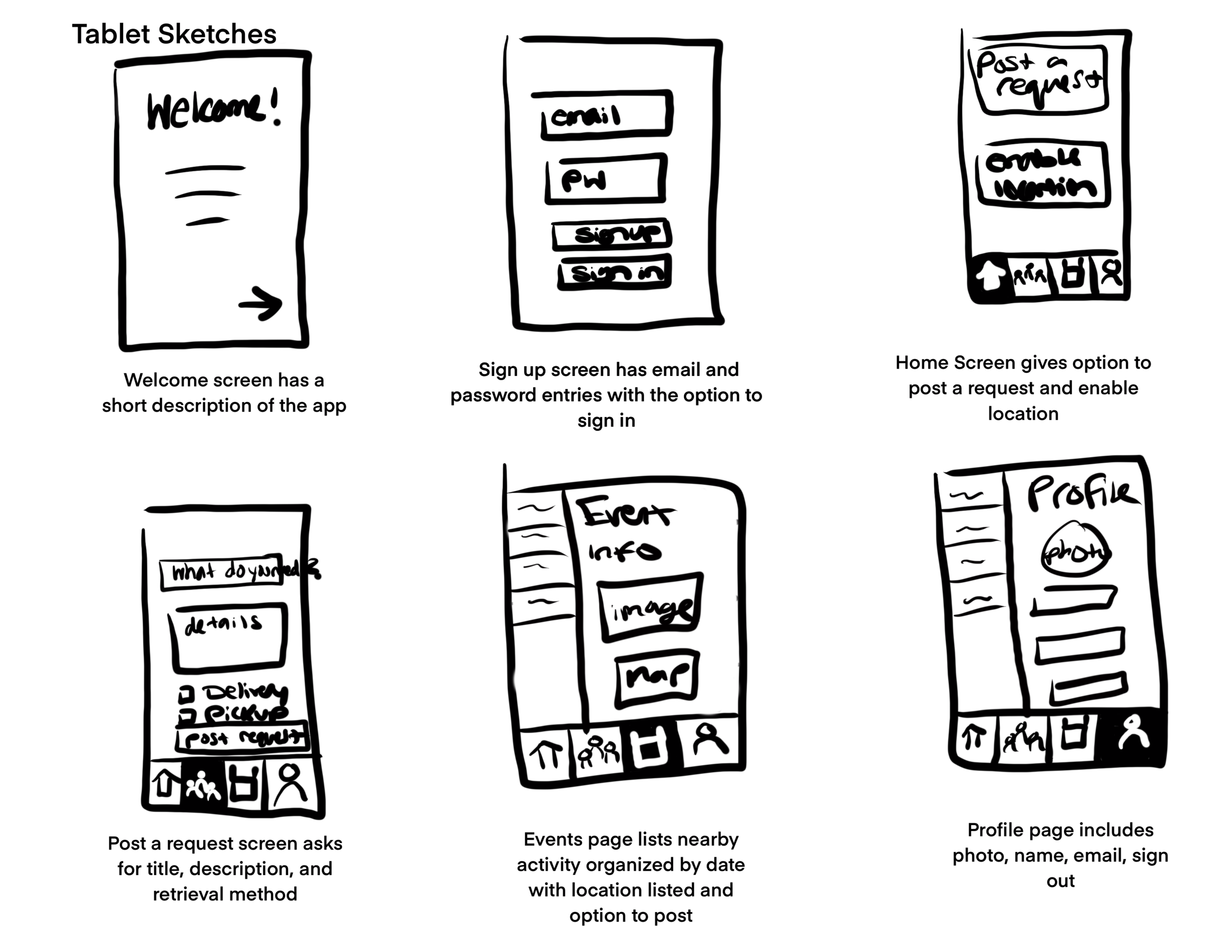 The second discussion was for our mobile screen designs. Some feedback I got was that my Requests and Events screens were too similar and that I should include more space for the user to include descriptions and images. I was also told that my Home Screen was duplicating navigation by including links to places that were already in the tab bar.