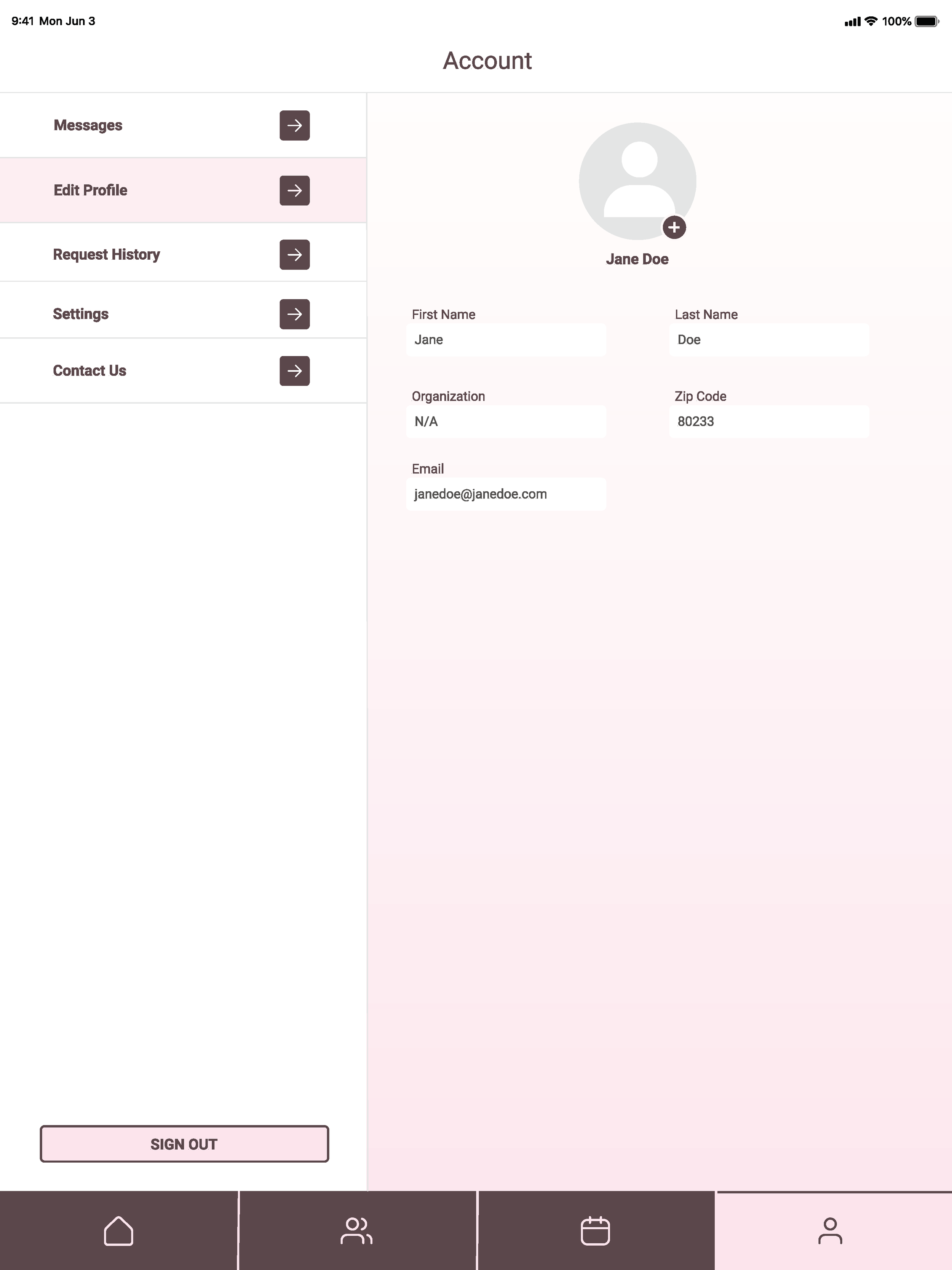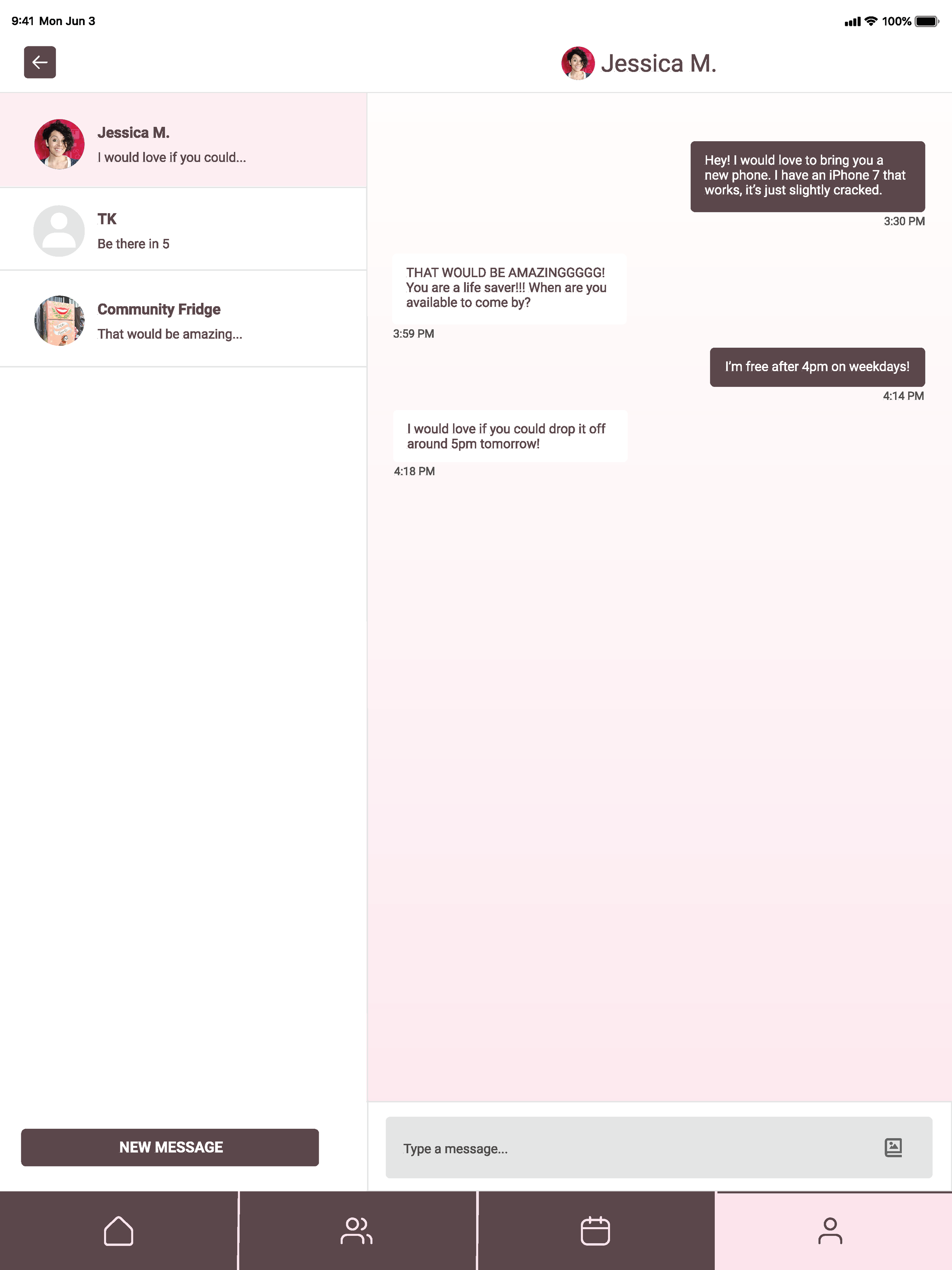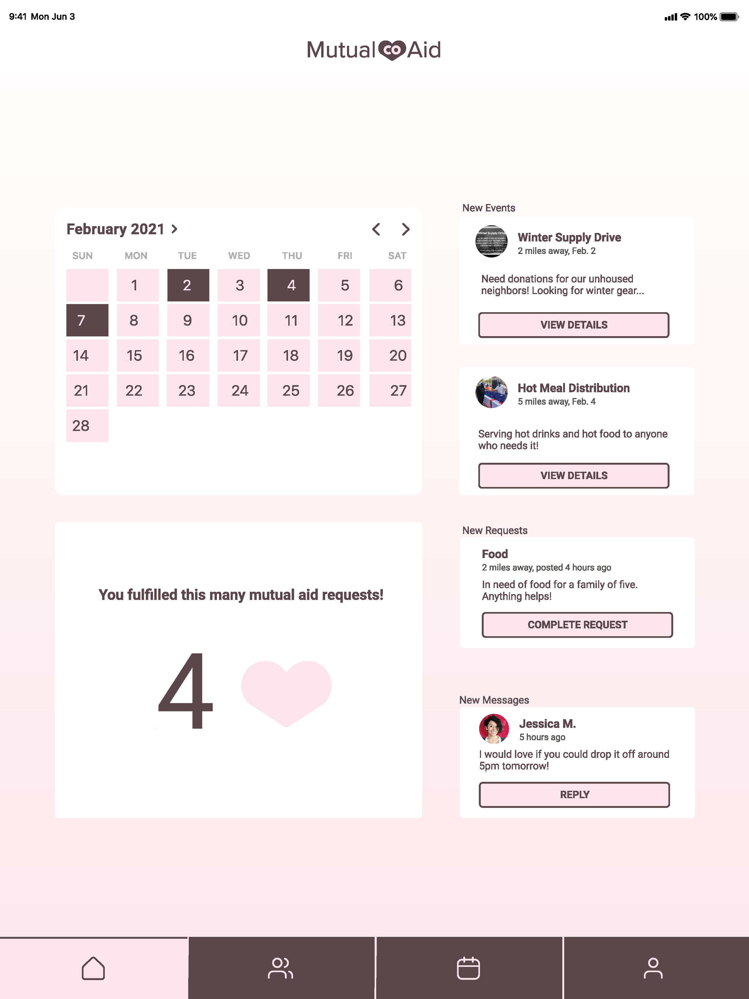 I revised my designs based on this feedback. As you can see in my final screens, I included a calendar and completed requests counter on the iPad and desktop versions where there was more space. I also added user imagery for the events page and changed my Home Screen so it was less repetitive.