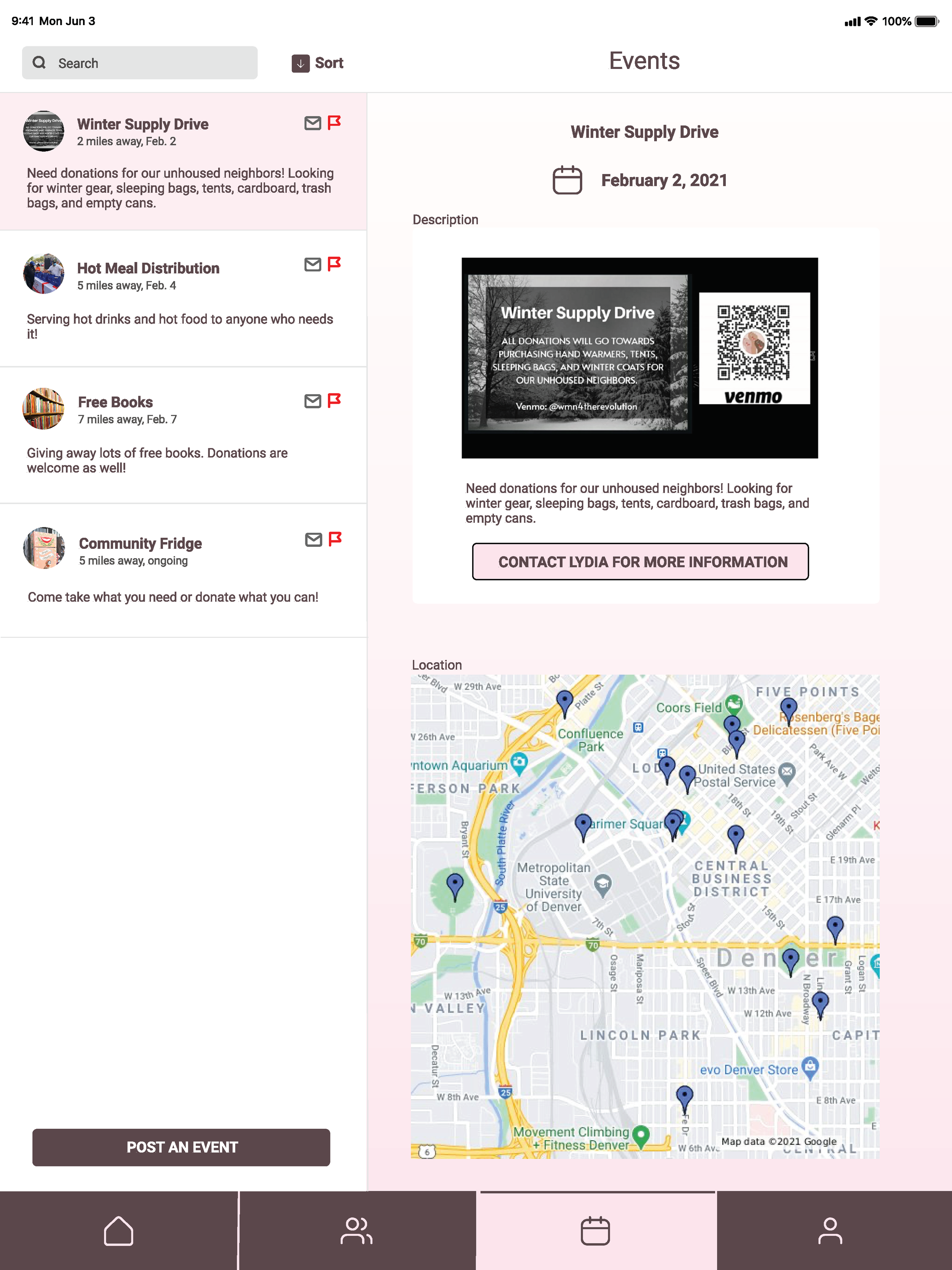 CO Mutual Aid will connect receivers and providers to all available resources in one app. There will be contact and location info for each organization, events in the user’s area and a neighborhood board where users can post and fulfill requests.